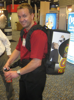 Really, that is a tank of coffee on his back. The gent was armed with cups and cream and sugar as well and made sure his contacts knew who he was and where to find his booth.