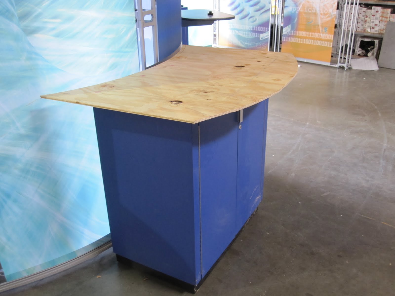 Add in some previously used cabinets with new tops and there is surface for demos and lockable storage. In this configuration you could have two cabinets per side of the major structure, or as many as 4 per unit. We are choosing to use two “football” shapes, with one cabinet station per side. Monitors will hang above the cabinets using the stock Skyline monitor bracket, possibly modified to hold multiple monitors.