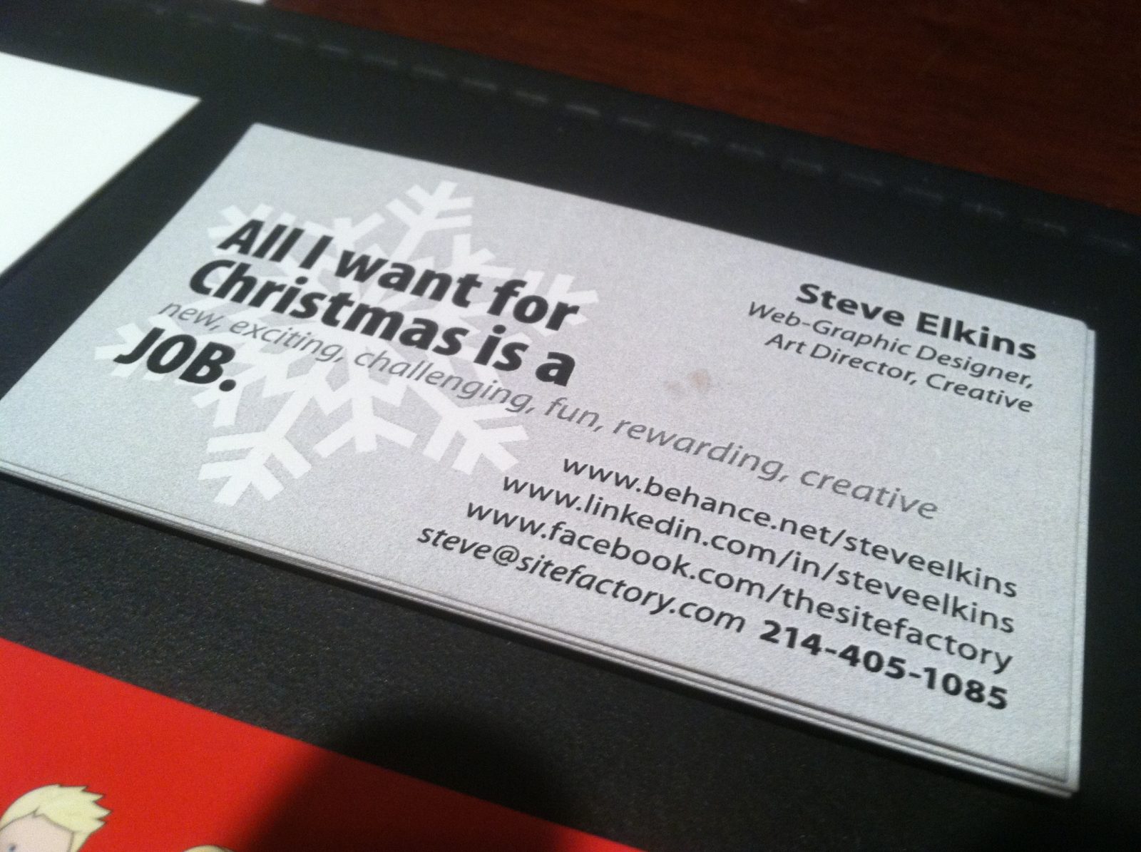 “I need a job for Christmas,” Steve told me when he introduced himself and handed me his card. The card had his name and title in the upper right-hand corner and the message to the left, “All I want for Christmas is a JOB” to the left over a snowflake. His tagline is “new, exciting, challenging, fun, rewarding, creative.” I’m guessing this last item refers both to the kind of job he wants as well as his key attributes.