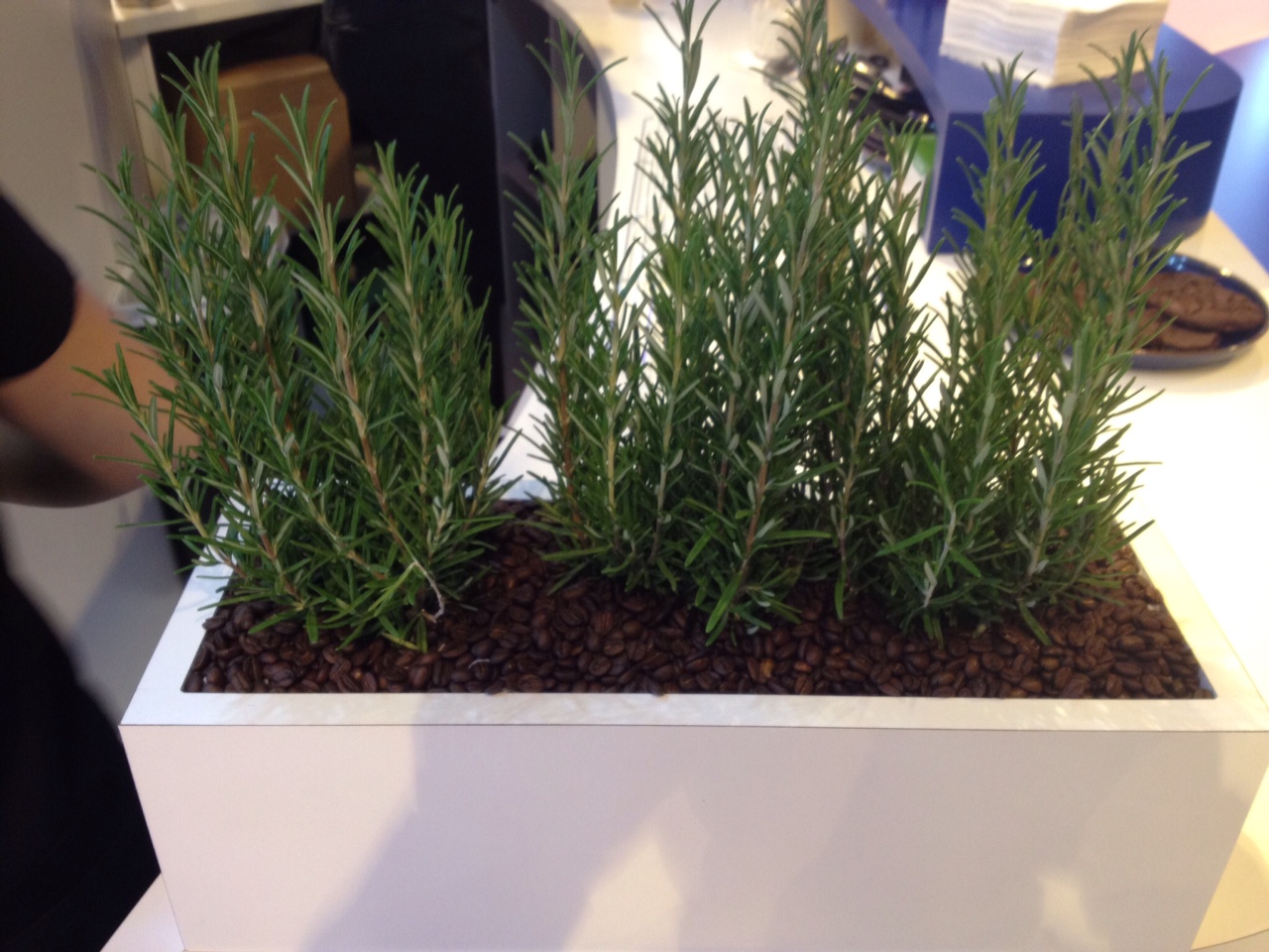 Without missing a beat, a simple laminated box featuring a basic plant from the show site and anchored by coffee beans, was assembled.  The on-site carpenter created the box from leftover scraps from the build of the stand.  The beans were procured from the coffee bar on the stand.  And the herbs came from a trip outside the exhibition hall at the airfield site.