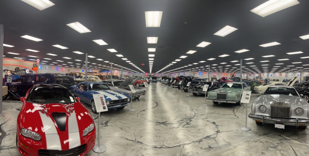 From the Tucker at the front door to the Vettes in the back of the hall, cars are arrayed along three aisles on a highly polished floor. In between are everything from 1960s drag cars to muscle cars to Model A Fords and customs (of note is an Ed “Big Daddy” Roth fiberglas thing). Scattered around the edges of the showroom are gas pumps and neon signs from eras gone by. Most of the cars are unlocked and visitors are invited to politely sit in them–only touch the steering wheels, thank you.